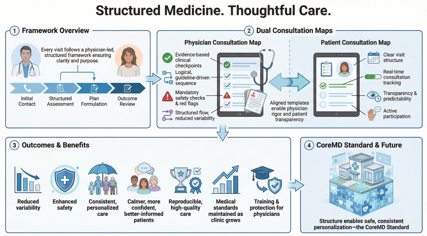 That is why every consultation at CoreMD follows a structured, physician-designed consultation framework — created to ensure consistency, clarity, and clinical rigor, regardless of the visit type.